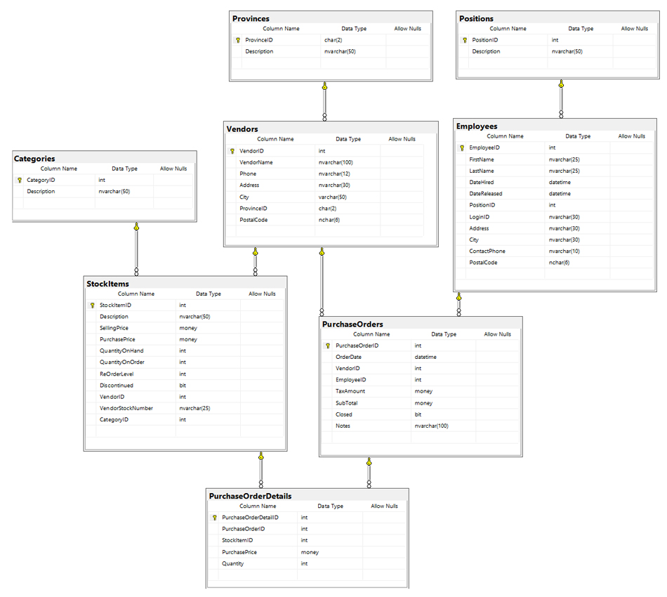 The database was already provided (pre-populated) by the course instructor, our team simply had to connect the application to the database. The purchasing section encompasses the following tables on the Entity-Relationship Diagram below (click for full view):