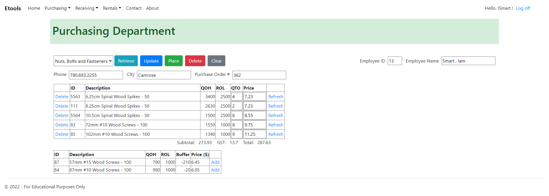 As the final project for my application development course, I was placed in a team of four (eventually three) students to individually create one section of a catalog website for a fictional tool sales & rental company. The simulated website would be for internal use only, managing four distinct parts of the business: purchasing, receiving, rentals, and sales.