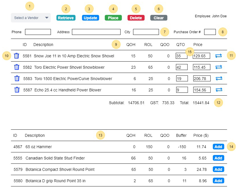 - Suggested Items table - Add: Add item button. Adds that item to the Order table and removes it from the Suggested Items table. The item is added with a quantity of 0 and the current item price.